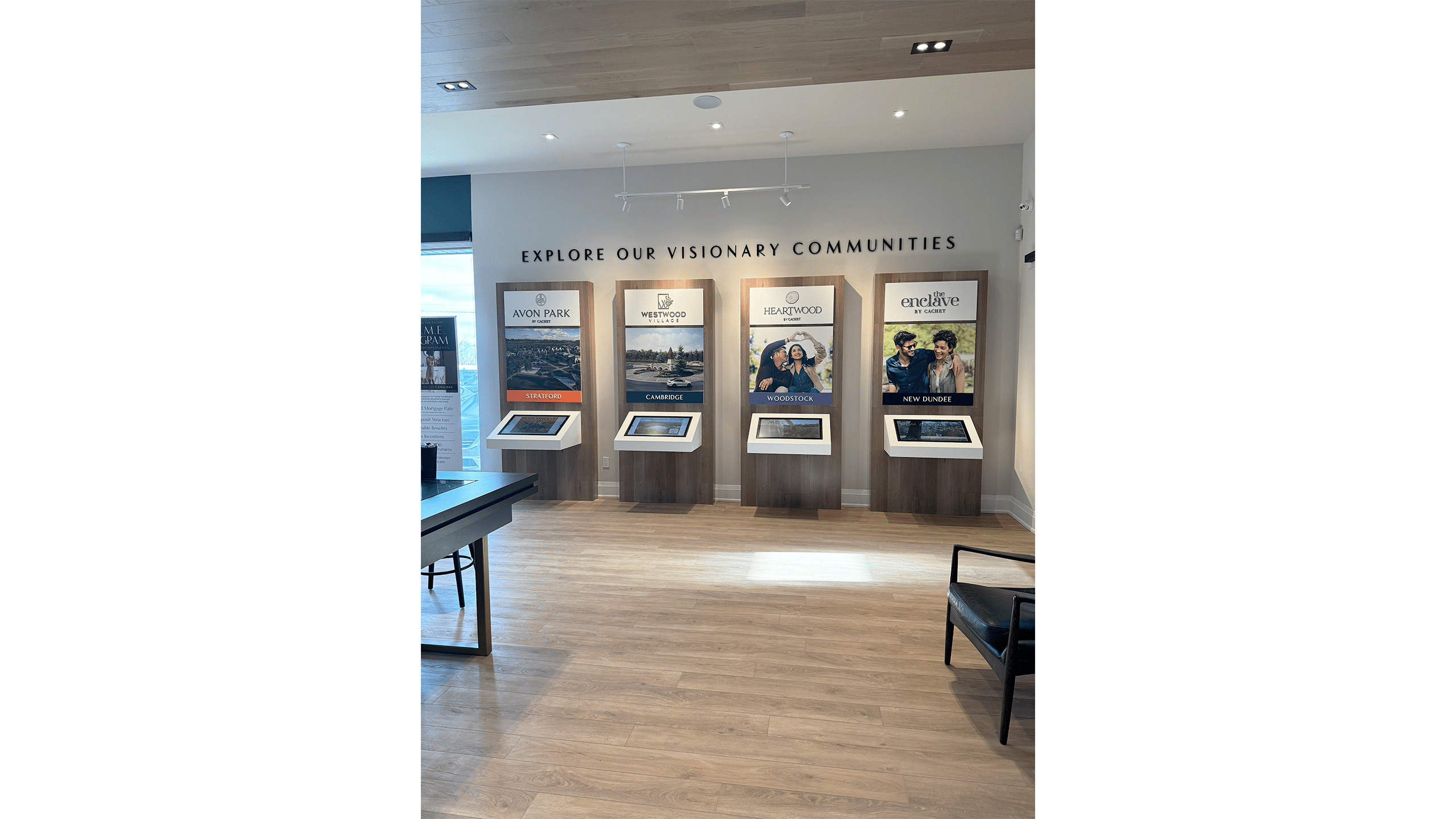 In Cambridge, our New Home Centre was renovated to allow for an improved sales and design studio experience. The Sales space was refreshed to make purchasing a home more pleasant with a new cafe, interactive podiums, and modern design elements. New appointment rooms were carved out for the Design Studio, as well. To ensure that design appointments are as seamless as possible, finishing samples were styled in each appointment room, design packages colour-coded, and monitors installed so homeowner’s design selections are easily viewed on screen.